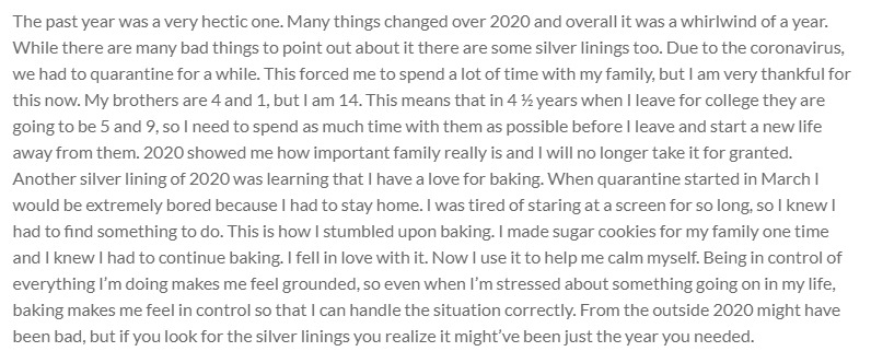 The past year was a very hectic one. Many things changed over 2020 and overall it was a whirlwind of a year. While there are many bad things to point out about it there are some silver linings too. Due to the coronavirus, we had to quarantine for a while. This forced me to spend a lot of time with my family, but I am very thankful for this now. My brothers are 4 and 1, but I am 14. This means that in 4 ½ years when I leave for college they are going to be 5 and 9, so I need to spend as much time with them as possible before I leave and start a new life away from them. 2020 showed me how important family really is and I will no longer take it for granted. Another silver lining of 2020 was learning that I have a love for baking. When quarantine started in March I would be extremely bored because I had to stay home. I was tired of staring at a screen for so long, so I knew I had to find something to do. This is how I stumbled upon baking. I made sugar cookies for my family one time and I knew I had to continue baking. I fell in love with it. Now I use it to help me calm myself. Being in control of everything I’m doing makes me feel grounded, so even when I’m stressed about something going on in my life, baking makes me feel in control so that I can handle the situation correctly. From the outside 2020 might have been bad, but if you look for the silver linings you realize it might’ve been just the year you needed.