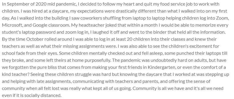 In September of 2020 mid pandemic, I decided to follow my heart and quit my food service job to work with children. I was hired at a daycare, my expectations were drastically different than what I walked into on my first day. As I walked into the building I saw coworkers shuffling from laptop to laptop helping children log into Zoom, Microsoft, and Google classroom. My headteacher joked that within a month I would be able to memorize every student's laptop password and zoom log in, I laughed it off and went to the binder that held all the information. By the time October rolled around I was able to log in at least 20 children into their classes and knew their teachers as well as what their missing assignments were. I was also able to see the children's excitement for school fade from their eyes. Some children mentally checked out and fell asleep, some punched their laptops till they broke, and some left theirs at home purposefully. The pandemic was undoubtedly hard on adults, but have we forgotten the pure bliss that comes from making your first friends in Kindergarten, or even the comfort of a kind teacher? Seeing these children struggle was hard but knowing the daycare that I worked at was stepping up and helping with late assignments, communicating with teachers and parents, and offering the sense of community when all felt lost was really what kept all of us going. Community is all we have and it's all we need even if it is socially distanced.
