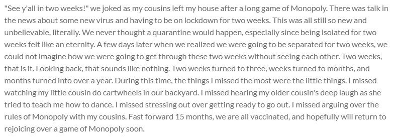 "See y'all in two weeks!" we joked as my cousins left my house after a long game of Monopoly. There was talk in the news about some new virus and having to be on lockdown for two weeks. This was all still so new and unbelievable, literally. We never thought a quarantine would happen, especially since being isolated for two weeks felt like an eternity. A few days later when we realized we were going to be separated for two weeks, we could not imagine how we were going to get through these two weeks without seeing each other. Two weeks, that is it. Looking back, that sounds like nothing. Two weeks turned to three, weeks turned to months, and months turned into over a year. During this time, the things I missed the most were the little things. I missed watching my little cousin do cartwheels in our backyard. I missed hearing my older cousin's deep laugh as she tried to teach me how to dance. I missed stressing out over getting ready to go out. I missed arguing over the rules of Monopoly with my cousins. Fast forward 15 months, we are all vaccinated, and hopefully will return to rejoicing over a game of Monopoly soon.