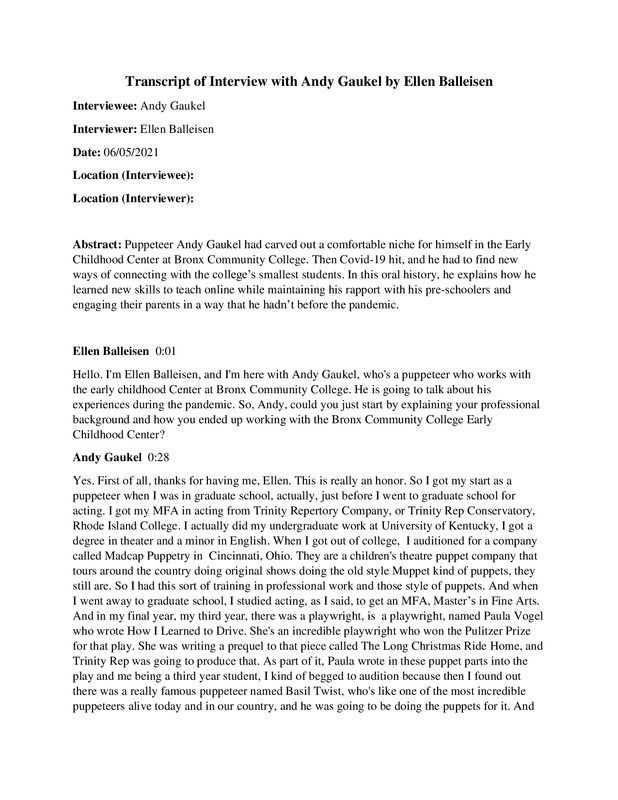 Puppeteer Andy Gaukel had carved out a comfortable niche for himself in the Early Childhood Center at Bronx Community College. Then Covid-19 hit, and he had to find new ways of connecting with the college’s smallest students. In this oral history, he explains how he learned new skills to teach online while maintaining his rapport with his pre-schoolers and engaging their parents in a way that he hadn’t before the pandemic.
