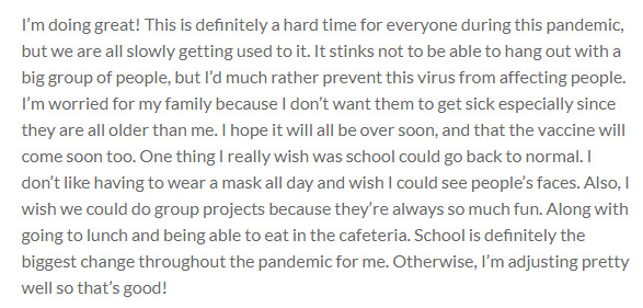 I’m doing great! This is definitely a hard time for everyone during this pandemic, but we are all slowly getting used to it. It stinks not to be able to hang out with a big group of people, but I’d much rather prevent this virus from affecting people. I’m worried for my family because I don’t want them to get sick especially since they are all older than me. I hope it will all be over soon, and that the vaccine will come soon too. One thing I really wish was school could go back to normal. I don’t like having to wear a mask all day and wish I could see people’s faces. Also, I wish we could do group projects because they’re always so much fun. Along with going to lunch and being able to eat in the cafeteria. School is definitely the biggest change throughout the pandemic for me. Otherwise, I’m adjusting pretty well so that’s good!