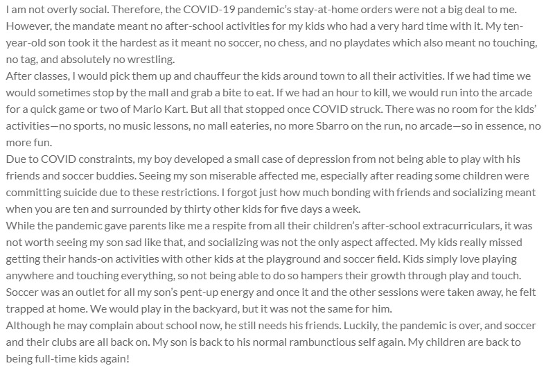 While the pandemic gave parents like me a respite from all their children’s after-school extracurriculars, it was not worth seeing my son sad like that, and socializing was not the only aspect affected. My kids really missed getting their hands-on activities with other kids at the playground and soccer field. Kids simply love playing anywhere and touching everything, so not being able to do so hampers their growth through play and touch. Soccer was an outlet for all my son’s pent-up energy and once it and the other sessions were taken away, he felt trapped at home. We would play in the backyard, but it was not the same for him.