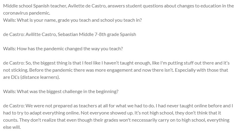 Middle school Spanish teacher, Avilette de Castro, answers student questions about changes to education in the coronavirus pandemic.