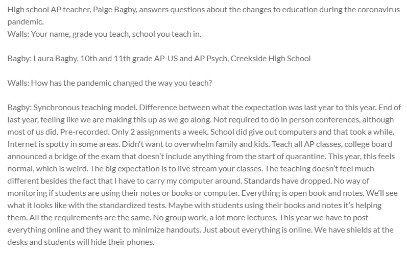 High school AP teacher, Paige Bagby, answers questions about the changes to education during the coronavirus pandemic.