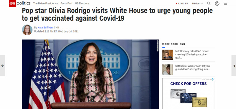 Rodrigo continued: "I'm in awe of the work President Biden and Dr. Fauci have done and was happy to help lend my support to this important initiative. It's important to have conversations with friends and family members encouraging all communities to get vaccinated, and actually get to a vaccination site, which you can do more easily than ever before, given how many sites we have and how easy it is to find them at vaccines.gov."