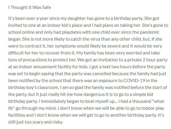 It's been over a year since my daughter has gone to a birthday party. She got invited to one at an indoor kid's place and I had plans on taking her. She's gone to school online and only had playdates with one child ever since the pandemic began. She is not more likely to catch the virus than any other child, but, if she were to contract it, her symptoms would likely be severe and it would be very difficult for her to recover from it. My family has been very worried and take tons of precautions to protect her. We got an invitation to a private 2 hour party at an indoor amusement facility for kids. I got a text two hours before the party was set to begin saying that the party was cancelled because the family had just been notified by the school that there was an exposure to COVID-19 in the birthday boy's classroom. I am so glad the family was notified before the start of the party, but it just really hit me how dangerous it is to go to a simple kid birthday party. I immediately began to beat myself up... I had a thousand "what-ifs" go through my mind. I don't know when we will be able to go to indoor play facilities and I don't know when we will get to go to another birthday party. It's still just too scary and risky.