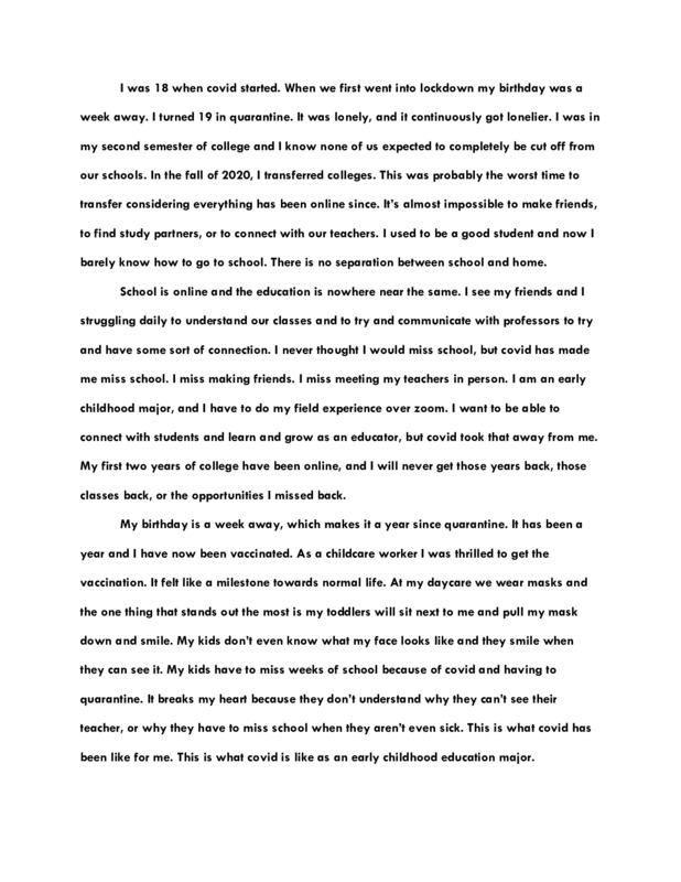 I wrote about my story through covid. I am a college student studying Early childhood education. I am also a child care worker. My submission is about what it was like going through college during covid. This is important to me because it's my experience and I know many other college students feel the same way.