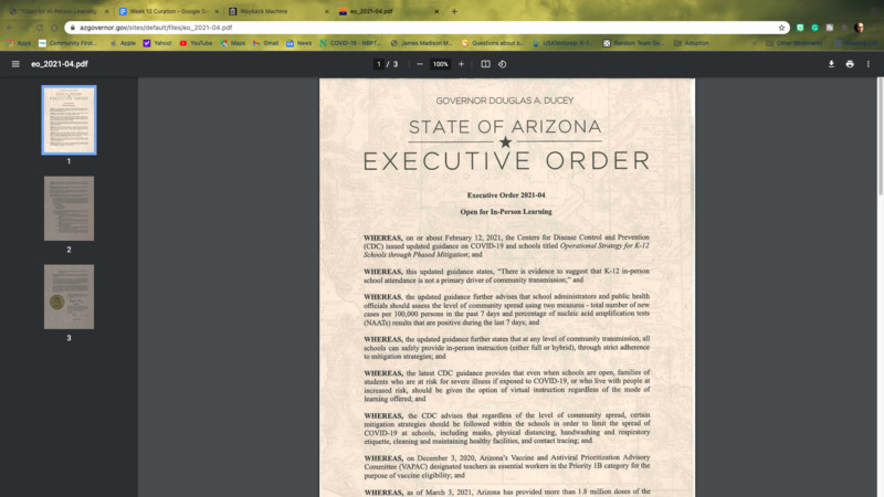 On February 12, 2021, the Centers for Disease Control and Prevention (CDC) issued guidance on COVID-19 as it relates to the "re-opening" of schools for in-person instruction. From the office of Governor Doug Ducey, Executive Order 2021-04 provides instruction for the Arizona Department of Education to follow in each district in the state of Arizona.