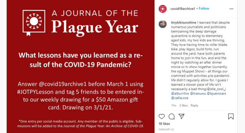 Looking back over my experience with the “Journal of the Plague Year” COVID-19 archive, my prevailing emotion is gratitude. This opportunity granted me experience that few historians earn, and the remote, asynchronous work schedule allowed me to collaborate with my colleagues in ways that maximized our respective contributions. The breadth and depth of our individual experiences and perspectives tremendously improved our collective process and products.