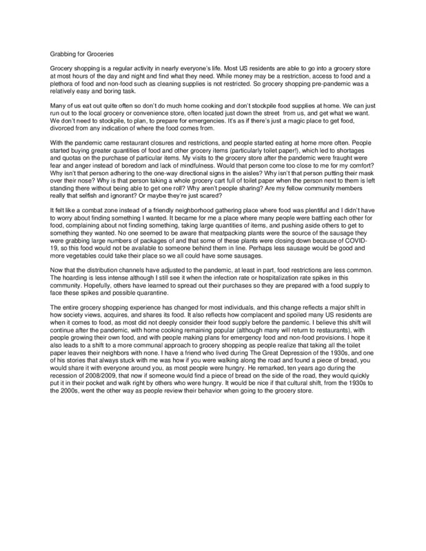 Grocery shopping is part of nearly everyone’s life. We’re used to going into a store at most hours of the day and night and finding what we need. Many of us eat out quite often so don’t stockpile food supplies at home and don’t cook at home very often. So grocery shopping pre-pandemic was a relatively easy and boring task. With the pandemic came restaurant closures and restrictions and people started eating at home more often. People started buying greater quantities of food and other grocery items (particularly toilet paper!), which led to shortages and quotas on the purchase of particular items. The grocery store became somewhat of a combat zone, with people battling each other for items and viewing others as the enemies who either were going to steal their food or give them the virus. The entire grocery shopping experience changed precipitously for most individuals and reflected a major shift in how society acquires and shares its food.