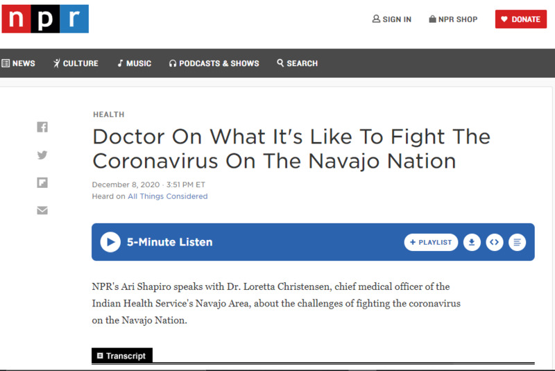 Interview between NPRs' Ari Shapiro and Chief Medical Officer of Indian Health Services, Dr. Loretta Christensen. Dr. Chirstensen discusses some of the challenges in covering an expansive area which includes Arizona, Utah, New Mexico.