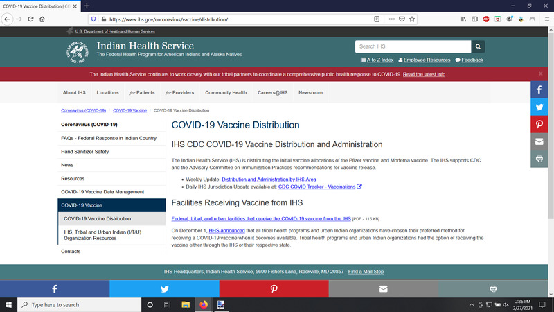 "The Indian Health Service is distributing the initial vaccine allocations of the Pfizer vaccine and Moderna vaccine. IHS supports CDC and the Advisory Committee on Immunization Practices recommendations for vaccine release, including prioritization of health care workers and residents of long-term-care facilities." -Indian Health Services
