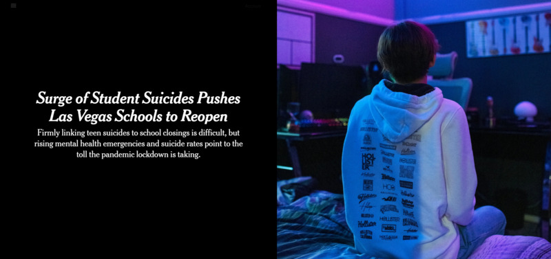 This is my worst fear for my students. All of us are on high alert for our students right now. The feeling of hopelessness is overwhelming our children. The next town over a child ended their life a few months ago. At the school board meetings, the children are saying that they feel desperate. I had a student who would put on a 72 hour hold for attempting to take her life before Christmas. I worry about my own pre-teen who is the most adaptive child I know, but he is missing his friends and his whole world has changed. I know my district is worried for the wellbeing of our kids. They want to open now, even if the numbers are high and even if we are not vaccinated yet. Anything to get these kids back into the classroom. The thing is suicide and depression are nothing new with kids. We know this. But now, I do not greet them at the door every morning, I do not see if they fall asleep in class every day, I can't stop them on their way out and ask if they are ok because I noticed a change in their body language. That ability saved kids before and now teachers cannot use that superpower to catch the kids when they fall. I worry that I will receive an e-mail telling me that one of our students did not make it through. That is my biggest fear right now.