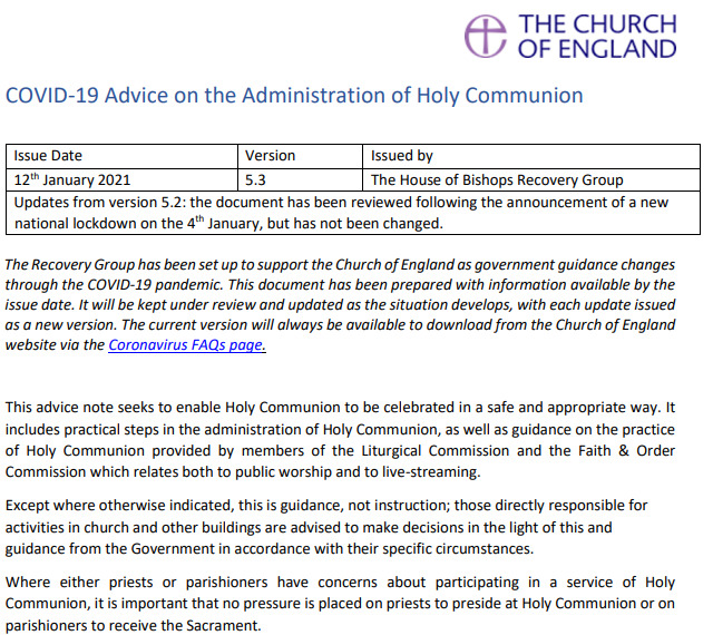 From the start of the pandemic, Christian churches have been debating about how to best handle the practice of the Eucharist (Communion). The Church of England, which spans all of the world, issued guidance on how to best celebrate/participate in the Eucharist. At the moment, the use of the common cup has been suspended. Parishioners during the pandemic are advised to only partake of the bread to avoid potential spread of the virus. These are general guidelines rather than strict rules, however, all Anglican churches are encouraged to follow.