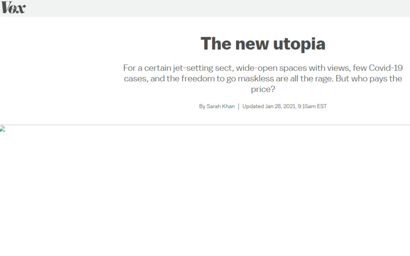 This Vox article by Sarah Khan is about the phenomenon of "pandemic tourism" to tropical places such as Tulum, Mexico; and Honolulu, Hawaii. According to Khan, these tourists, usually Western, seek to escape quarantine restrictions in their home countries and risk the health of foreigners by bringing COVID-19 with them.