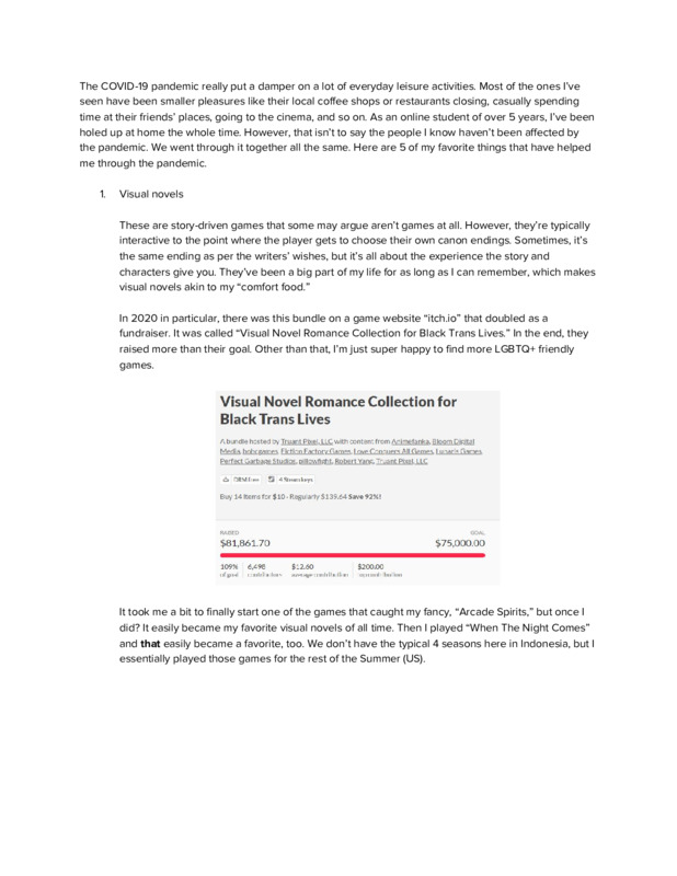 As the title suggests, this is a description of my favorite things that helped me through the pandemic. I think it's important to capture the pleasures we've fallen back on despite all the negatives.