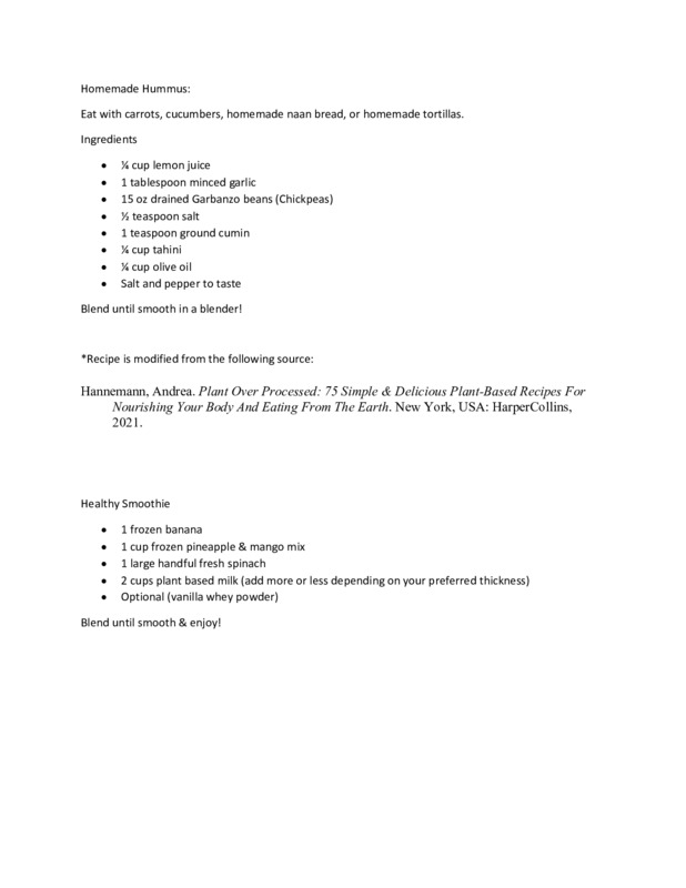 Once the pandemic was in full swing, food became rather scarce out in the county where I live. Frozen meals? Gone. Frozen vegetables? Gone. Meat? Gone. Dairy products? Sparse. What I could find in abundance were fresh fruit and vegetables. Largely because these do not store long term and people were stocking up on everything that they could hoard for the long haul. Could I really sustain my meat-loving family of 4 on fresh fruits and vegetables to help stretch our very thin stock of meats and dairy products? I have included some basic recipes that I used to help get through the pandemic. This massive change in diet left a lasting impact on my experience of the pandemic through my sense of smell, taste, and hearing. Meals no longer smelled like warm cooked meat with roasting potatoes. Meals became light and fresh. My house began smelling more like a garden every time I prepared a meal. I also no longer smelled the warmth of the stove or the smell of a pan heating up, since we chose to eat a lot of the plants and fruits in a more raw style to get the maximum nutritional value. The taste of meals and snacks changed from processed foods to natural snacks like nuts, dates, and dried fruit. I could taste the change from the pandemic. Everyday noises that would occur in my pre-pandemic household were no longer present in my pandemic household. No longer was there the sound of the oven turning on, the microwave running, or oil popping in the pan on the stove top. Instead, the new normal sounds were that of the food processor to make hummus, the sound of the blender making smoothies, and the sharp tap of the knife colliding with the cutting board. The recipes I chose to include are ones that we started with that have changed the way we eat. These were the easiest to sustain with readily available produce in my rural area.