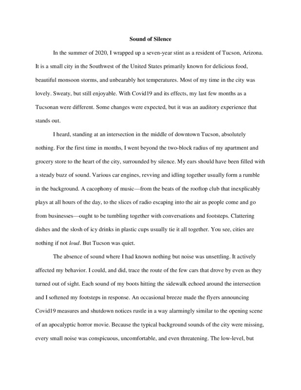 The experience I am sharing focuses on my sense of hearing. Work has shifted away from office buildings and into our homes and, as a result, downtown urban areas emptied. This was especially true in mid-May of 2020. The one time I was in my city's downtown, it was uncomfortably quiet, and the negative reaction I had in the moment caught me off guard. Covid19 put me in a constant state of anxiety, and this is one more example of how seemingly small differences in a familiar environment can turn us upside down.