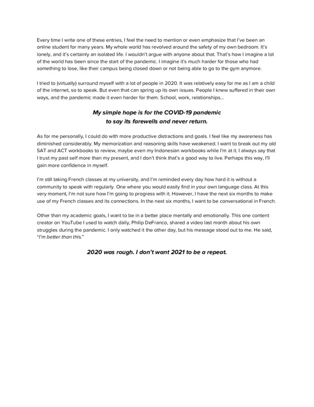 Starting off this year I was dogsitting for a friend. 2020 was hard on me as it was for everyone else in the world but there was something peaceful about ending a year with comforting a bed hog of a dog that was scared of fireworks. Waking up the next day to feed her and go about my first day of 2021 I felt at peace, almost like perhaps this year would be drastically different for me. I'm about to graduate college, we have a new governmental administration that I hope will be more favorable to me, and COVID vaccines are on their way. Then we had an insurrection and I refused to open canvas for the first week of school because every time I tried I was gripped with terror at the thought that this would be my last semester in college meaning that I had to be a real adult soon. There is no functional difference that the exchange from 2020 to 2021 brought to my physical or emotional state. Like everyone else, I'm excited for COVID to be over but I know that the changes I need have to come from myself and won't be ushered in by a new year new me mentality. Throughout 2020 I spent time trying to reach out for help with my mental health and other things I had been struggling with. I think the thing I'm most excited about in 2021 is continuing the work I've started in a world that isn't so hard to be in. I want 2021 to be a year that I am able to spend working on myself and building into a fully functioning member of society.