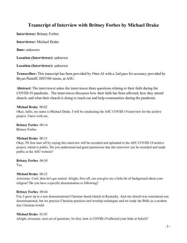 Michael Drake Interviews a fellow student, Britney, on how COVID has affected their religion or their ability to attend services.