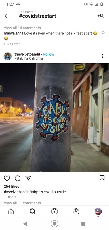 This post was made by the street artist, Velvet Bandit, of their past up on a pole in Petaluma, California. The artwork is a cartoon virus with the message "Baby it's covid outside" over it.