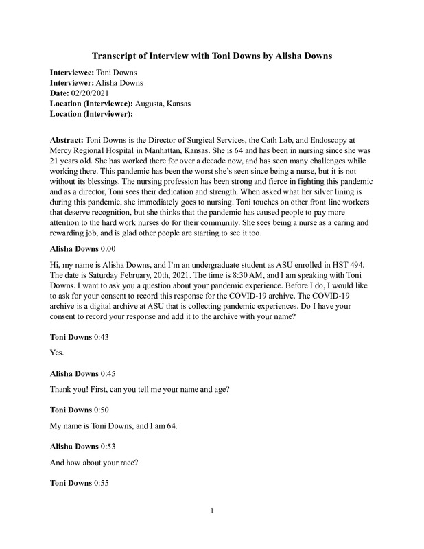 Toni Downs is the Director of Surgical Services, the Cath Lab, and Endoscopy at Mercy Regional Hospital in Manhattan, Kansas. She is 64 and has been in nursing since she was 21 years old. She has worked there for over a decade now, and has seen many challenges while working there. This pandemic has been the worst she’s seen since being a nurse, but it is not without its blessings. The nursing profession has been strong and fierce in fighting this pandemic and as a director, Toni sees their dedication and strength. When asked what her silver lining is during this pandemic, she immediately goes to nursing. Toni touches on other front line workers that deserve recognition, but she thinks that the pandemic has caused people to pay more attention to the hard work nurses do for their community. She sees being a nurse as a caring and rewarding job, and is glad other people are starting to see it too.