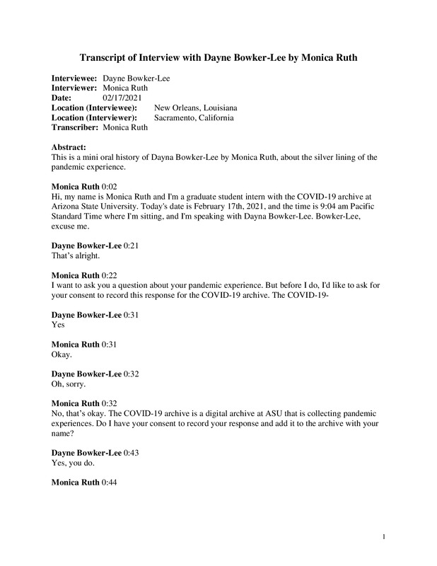 This is a mini oral history of Dayna Bowker-Lee by Monica Ruth, about the silver lining of the pandemic experience.