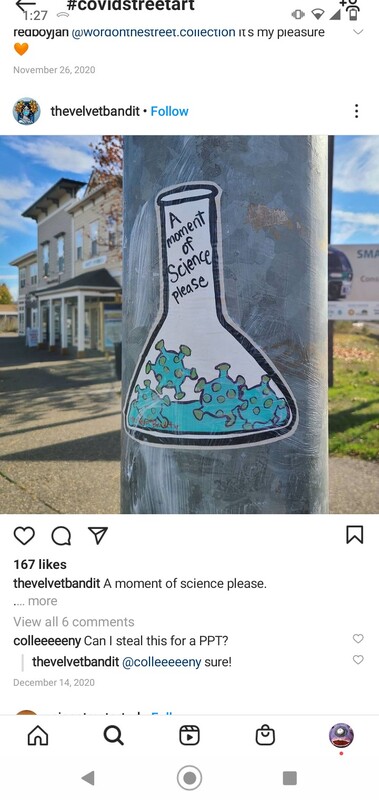 This Instagram post was made by the street artist Velvet Bandit of their work depicting a chemistry beaker with cartoon style viruses inside. The message, "A moment of science please," is a play on a well-known phrase "a moment of silence, please" that is used in gatherings to honor people that have died. Hundreds of thousands of people have died from the pandemic and this street art is making commentary on pandemic deniers.