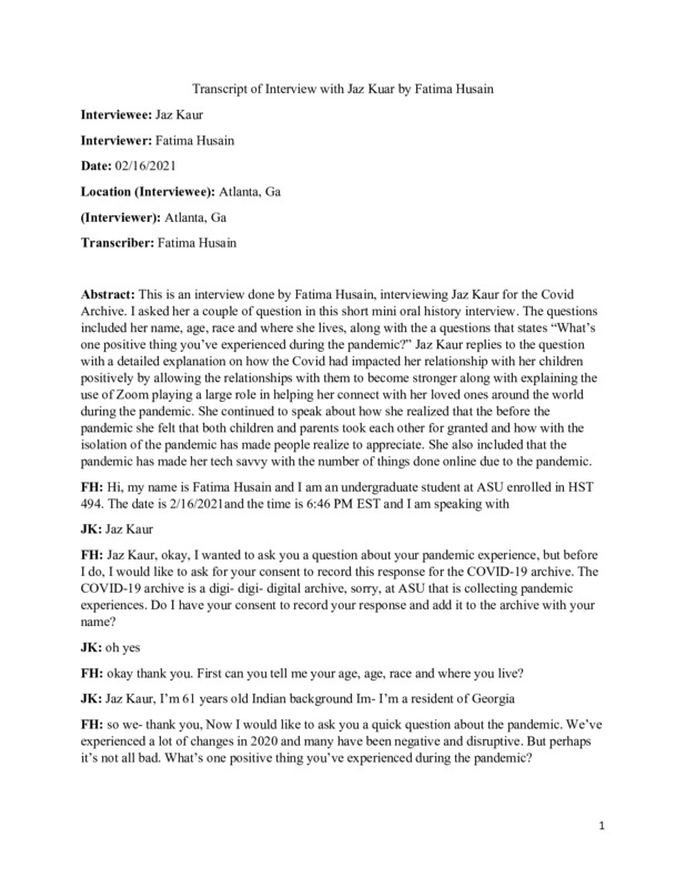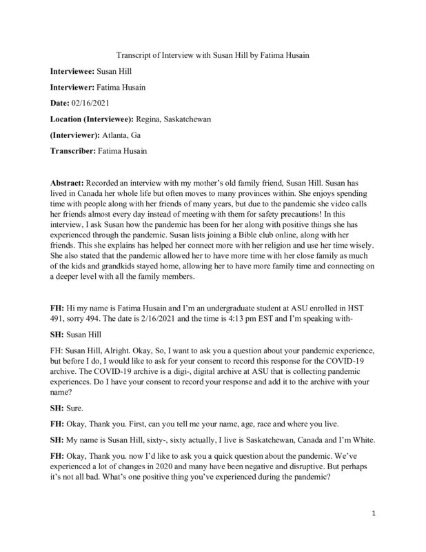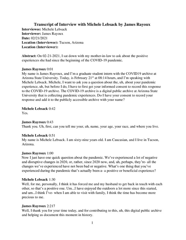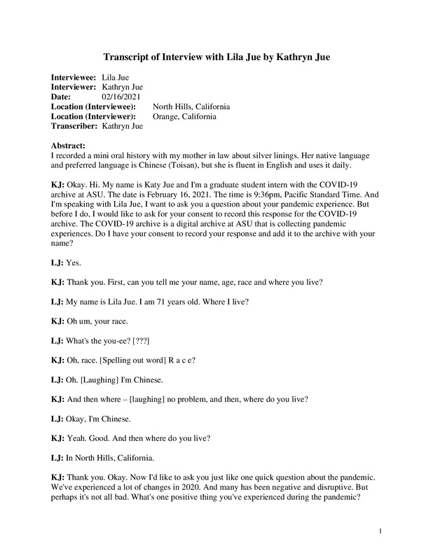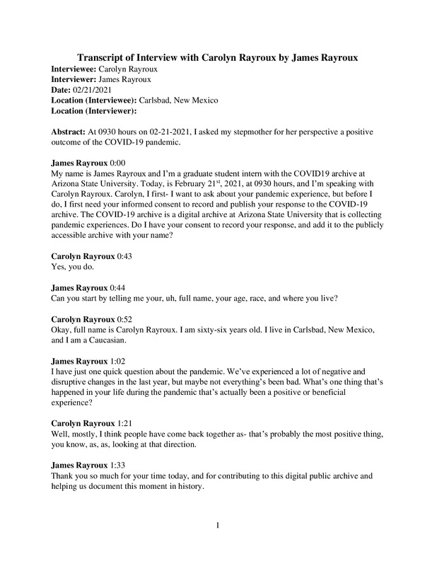 On 02-21-2021, I sat down with my mother-in-law to ask about the positive experiences she had since the beginning of the COVID-19 pandemic.