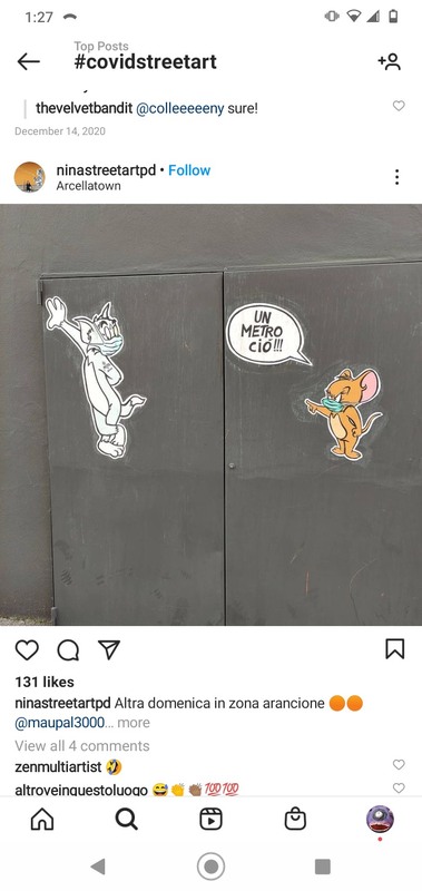This post is a picture of paste up of well known cartoon characters Tom and Jerry. Both are wearing masks and Jerry is telling Tom, "That's one meter!" in Italian.