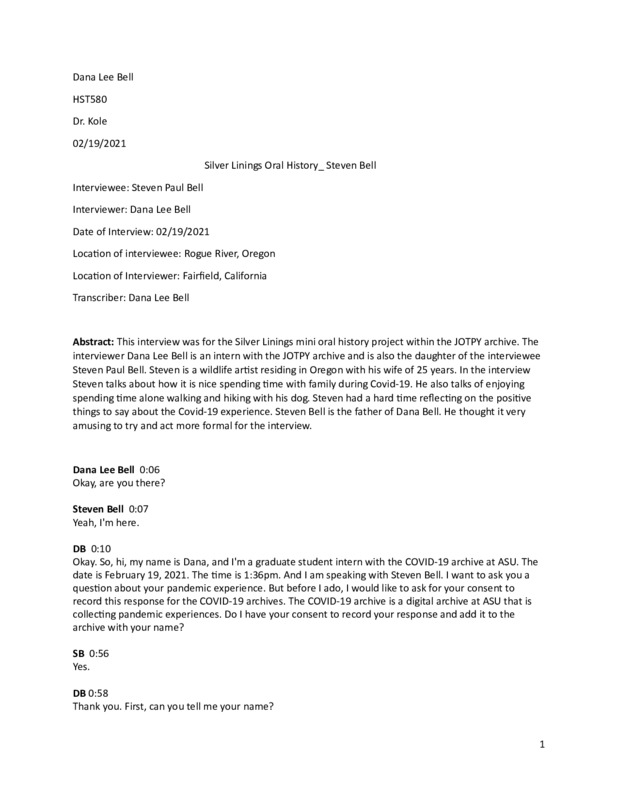 Abstract: This interview was for the Silver Linings mini oral history project within the JOTPY archive. The interviewer Dana Lee Bell is an intern with the JOTPY archive and is also the daughter of the interviewee Steven Paul Bell. Steven is a wildlife artist residing in Oregon with his wife of 25 years. In the interview Steven talks about how it is nice spending time with family during Covid-19. He also talks of enjoying spending time alone walking and hiking with his dog. Steven had a hard time reflecting on the positive things to say about the Covid-19 experience. Steven Bell is the father of Dana Bell. He thought it very amusing to try and act more formal for the interview.