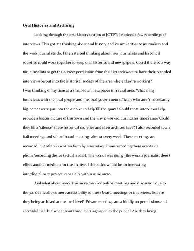 Looking through the oral history section of JOTPY, I noticed a few recordings of interviews. This got me thinking about oral history and its similarities to journalism and the work journalists do. I then started thinking about how journalists and historical societies could work together to keep oral histories and newspapers. Could there be a way for journalists to get the correct permission from their interviewees to have their recorded interviews be put into the historical society of the area where they’re working?