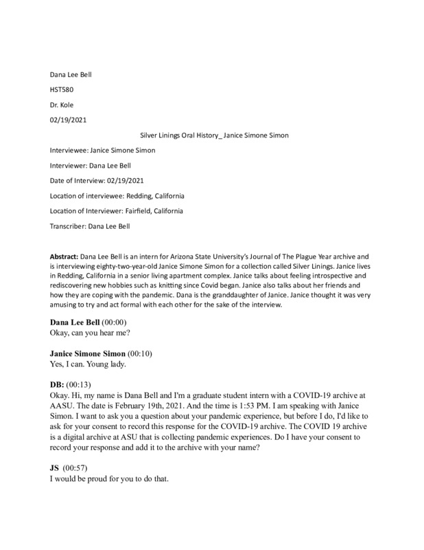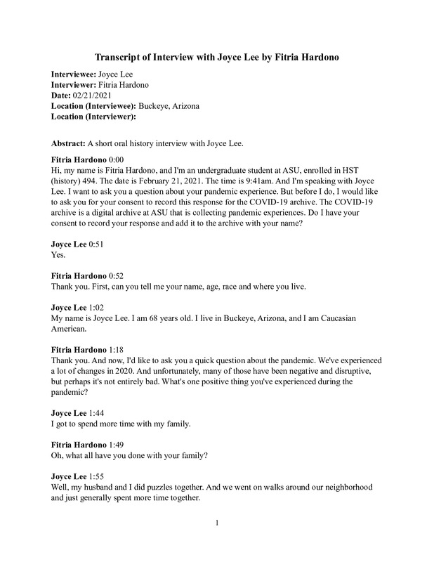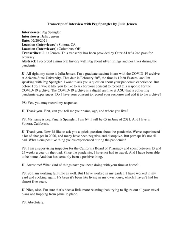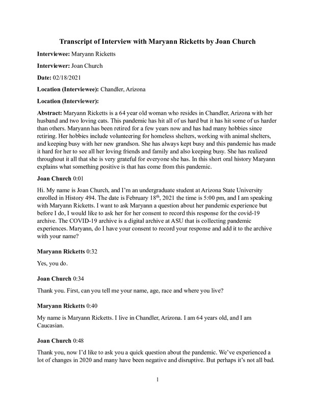 Maryann Ricketts is a 64 year old woman who resides in Chandler, Arizona with her husband and two loving cats. This pandemic has hit all of us hard but it has hit some of us harder than others. Maryann has been retired for a few years now and has had many hobbies since retiring. Her hobbies include volunteering for homeless shelters, working with animal shelters, and keeping busy with her new grandson. She has always kept busy and this pandemic has made it hard for her to see all her loving friends and family and also keeping busy. She has realized throughout it all that she is very grateful for everyone she has. In this short oral history Maryann explains what something positive is that has come from this pandemic.