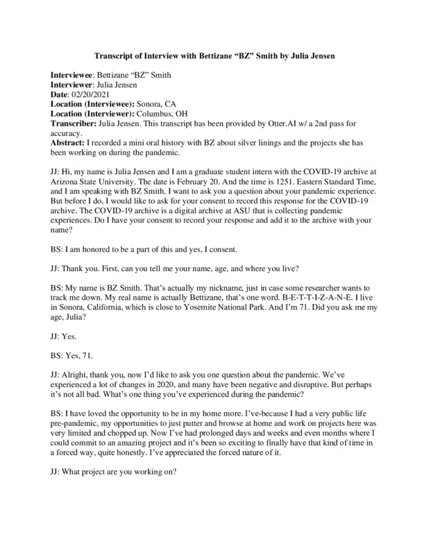I recorded a mini oral history with BZ about silver linings and the projects she has been working on during the pandemic.