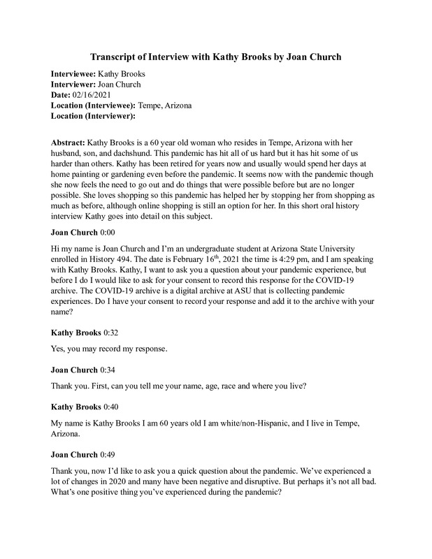 Kathy Brooks is a 60 year old woman who resides in Tempe, Arizona with her husband, son, and dachshund. This pandemic has hit all of us hard but it has hit some of us harder than others. Kathy has been retired for years now and usually would spend her days at home painting or gardening even before the pandemic. It seems now with the pandemic though she now feels the need to go out and do things that were possible before but are no longer possible. She loves shopping so this pandemic has helped her by stopping her from shopping as much as before, although online shopping is still an option for her. In this short oral history interview Kathy goes into detail on this subject.