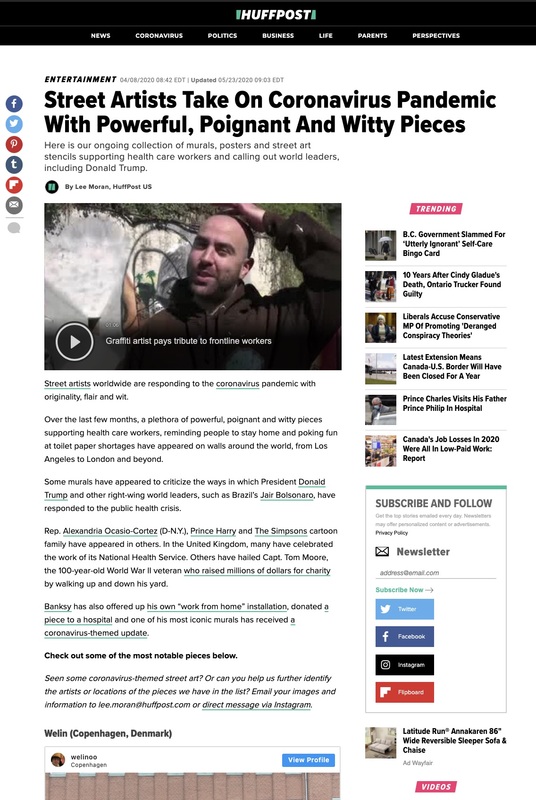 This article talks about street art around the world responding to the pandemic with satire, humor, political commentary, observation and expression. What stands out most with this article is the video interview of a street artist while he is completing a piece of art honoring frontline workers.