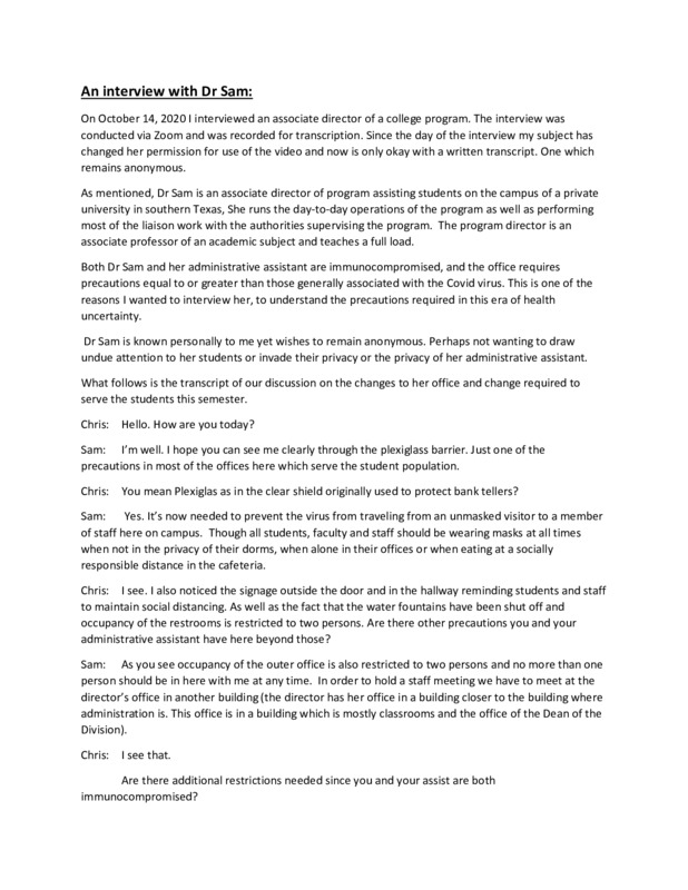 An interview with an administrator about some of the adaptations needed to work in the pandemic. This like my other submissions is important because I am a member of the high risk group for the virus. Prevention of its spread is important to all of us.