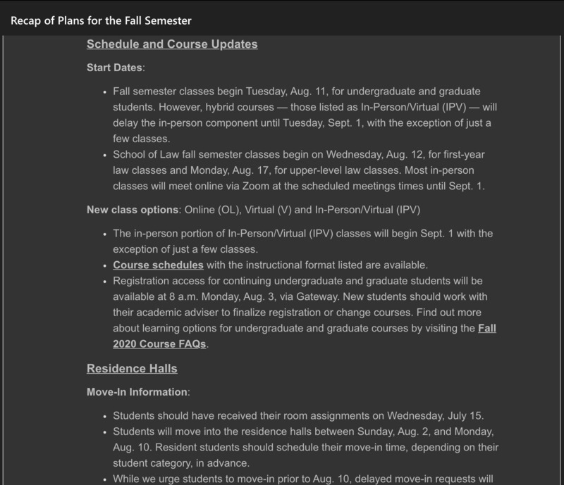 These images are screenshots of emails from St. Mary’s University detailing how the university will adapt for the Fall 2020 semester, updating students on the ongoing changes to in-person classes, tracking the number of COVID-19 cases throughout the summer and into the fall, and showing how St. Mary’s slowly begins to open up and allow in-person gatherings.