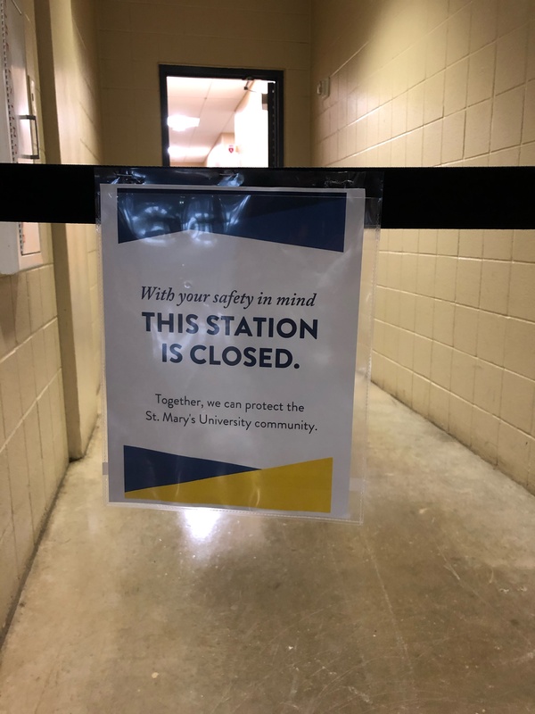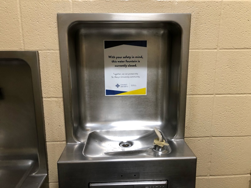 This photograph was taken of a water fountain in the athletics and recreation building at St. Mary's University. The water fountains are all blocked off with signage in the building besides the fountains that allow for the placement of a water bottle beneath it to be filled, unable to directly drink from it.