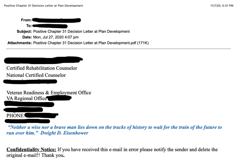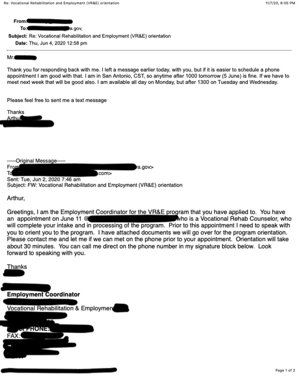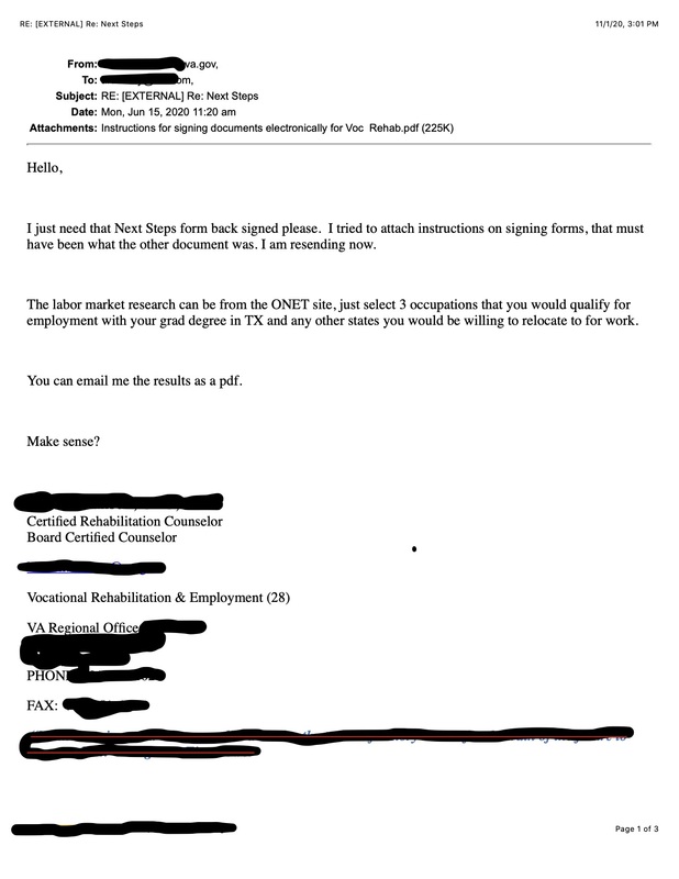 My first steps to contact the VA for Voc Rehab benefits started in the summer of 2019, I was denied, – even with 6 hours to finish my undergrad the councilor wanted me to start construction education and career. If it wasn’t for my new VA representative at St. Mary’s University that showed me much interest, I would not have perused the program again. This email comes after my initial conversations with the StMU VA office back in late April of 2020. Realizing that this email was from another state, I worried if the counselors would be “just” to me being located in Texas. Covid-19 was making things almost impossible to complete quickly, and now I am emailing with people across the country. How long will the process take?