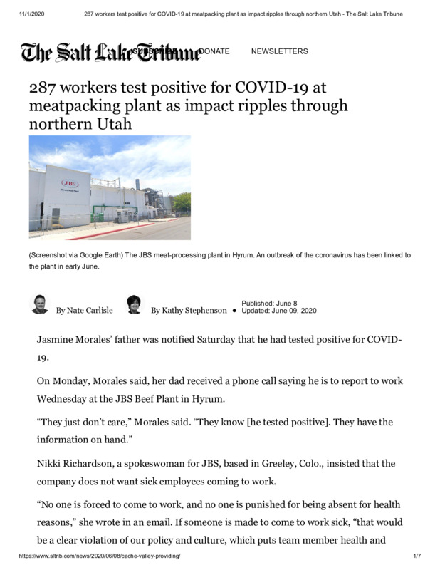 I wanted to include these news articles about an event that happened in my community. 287 workers at JBS meatpacking plant tested positive for COVID-19 at the beginning of Summer 2020.