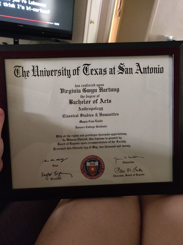 That's why I have my undergraduate degree on the wall right by my desk. If I get to feeling bad about myself, feeling afraid to be proud of myself, I look at my diploma and realize that I have done things a younger me wouldn't have dreamed of. It's okay if you aren't the smartest person in the world. You're allowed to feel proud of yourself, I hope that this reminder helps me when I need it most.