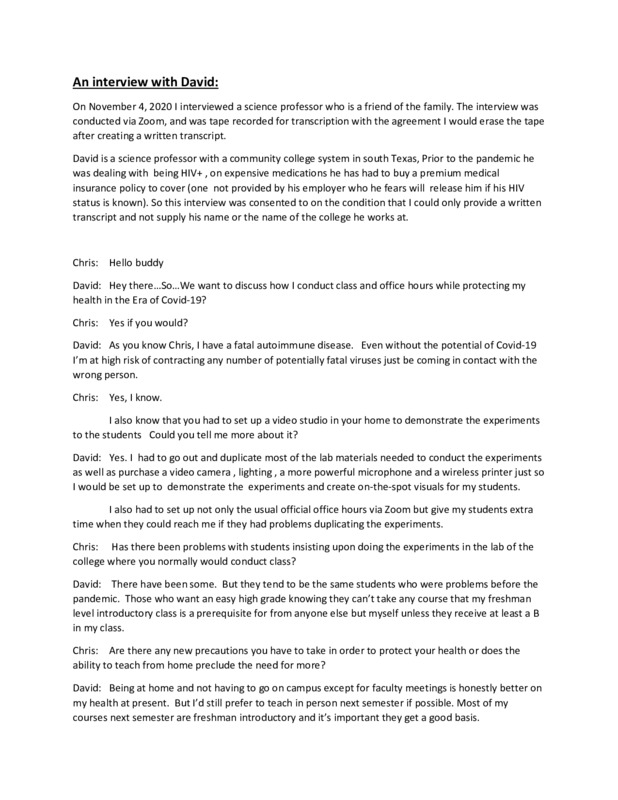 This is an interview with an instructor who had to adapt to teaching online from live demonstration. He also has health challenges. It's important to me because the health of all of us is important in the pandemic. Especially those in the high risk group like myself.