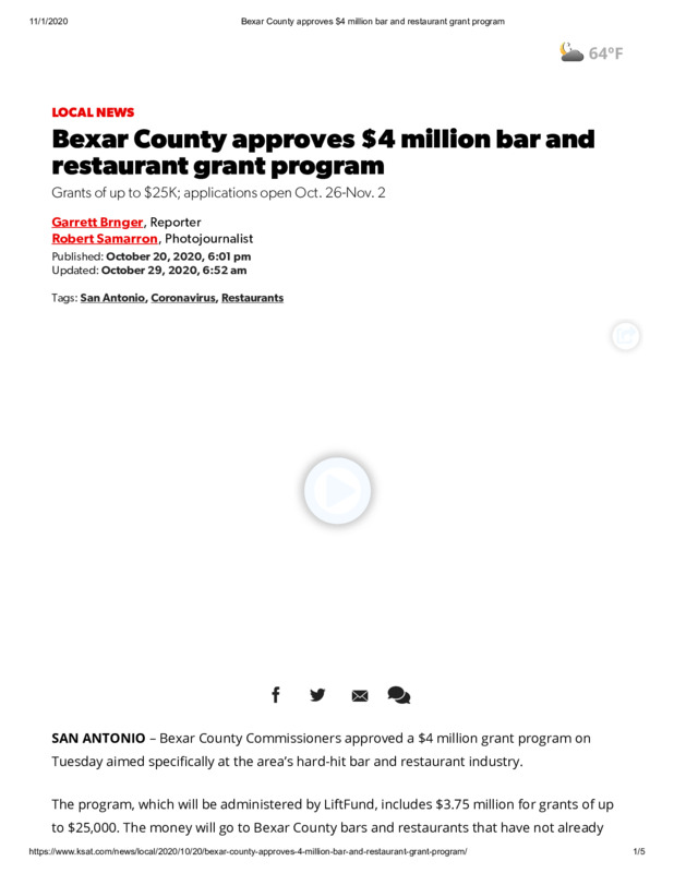 This news article is about the San Antonio Shiran family business during COVID-19. In July 2020, the family tested positive and the husband/father, Harvey, was in the ICU for the month. This forced the wife/mother, Lindsey, to take over the family business. I also attached another news article about a Bexar County grant program for bars and restaurants affected by COVID-19.