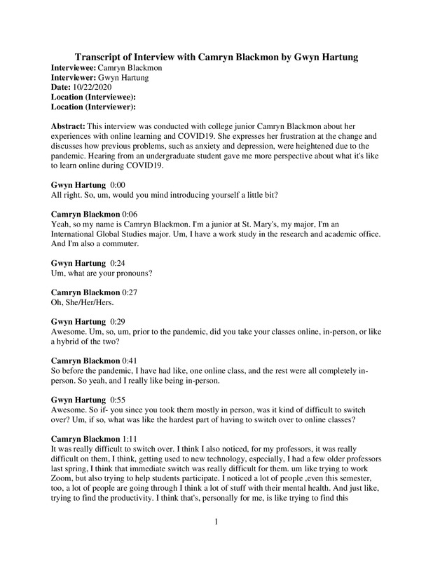 This interview was conducted with college junior Camryn Blackmon about her experiences with online learning and COVID19. She expresses her frustration at the change and discusses how previous problems, such as anxiety and depression, were heightened due to the pandemic. Hearing from an undergraduate student gave me more perspective about what it's like to learn online during COVID19.