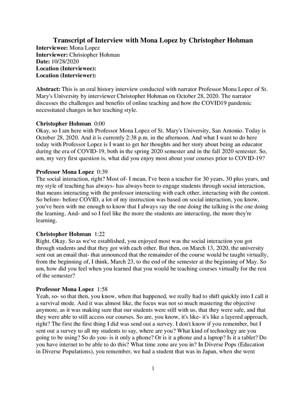 This is an oral history interview conducted with narrator Professor Mona Lopez of St. Mary's University by interviewer Christopher Hohman on October 28, 2020. The narrator discusses the challenges and benefits of online teaching and how the COVID19 pandemic necessitated changes in her teaching style.