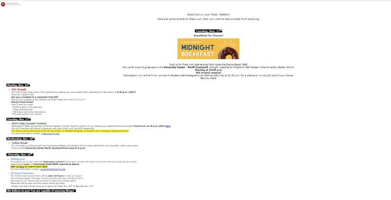 Part of attending college, both as an undergrad and graduate student, are campus activities. Some are designed to be fun, or educational, stress relieving, or to create a sense of community amongst the students. Sometimes you just walk into them as you are traveling about campus, or you see a flyer or an announcement e-mail for the event. The pandemic, and the constraints that go along with it have changed how these events happen. While some events happen in person, to comply with social distancing regulations, they are limited to how many people can attend, requiring a registration link. Other events that used to happen in person are now conducted over Zoom or other video conferencing platforms.