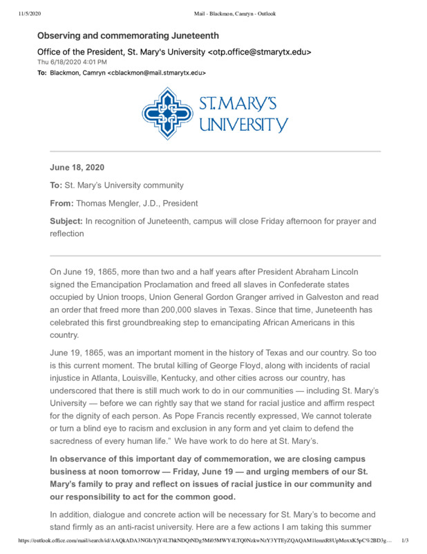The object is an email from St. Mary's University President Thomas Mengler recognized Juneteenth stating that campus will be closed that Friday, June 19th, 2020, for prayer and reflection on racial justice and racism in the U.S. In the email, President Mengler acknowledges the murder of George Floyd to reflect on during the summer of mass protests and the Black Lives Matter movement. The campus community is also called to action with upcoming initiatives to create an "anti-racist" university. Dialogue and action are said to occur and relate to the Mariniast belief and tradition to act for the common good.