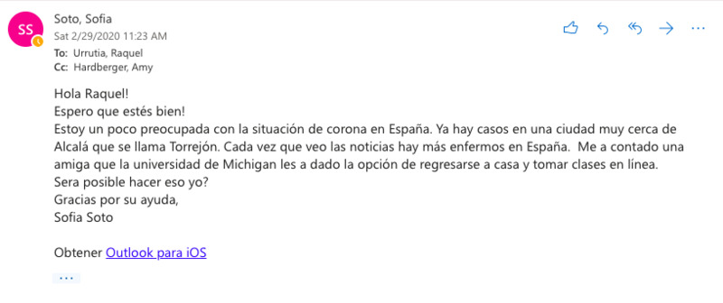 This is an email I sent St. Mary's study abroad coordinator, Raquel, at the end of February while I was studying abroad in Alcalá de Henares, Spain. Cases were increasing in surrounding cities and I was beginning to worry. Students from my international program at the Universidad de Alcalá were being sent home and I was unsure of what my options were at the time. Nobody knew how serious and widespread Coronavirus would become, but I feel grateful that I listened to my intuition and came home on March 12th before Trump decided to close the borders on March 13th. This experience is unforgettable to me and many others who were abroad at this time.