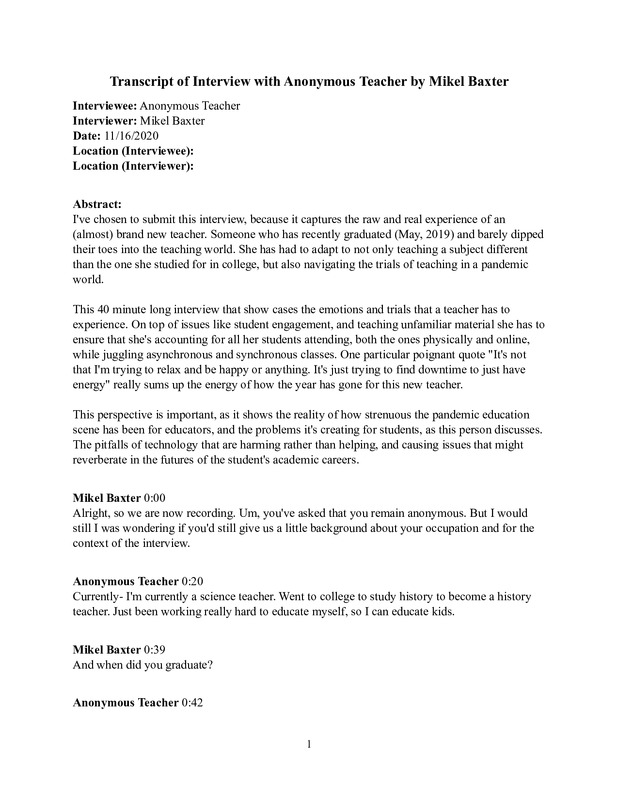 This 40 minute long interview that show cases the emotions and trials that a teacher has to experience. On top of issues like student engagement, and teaching unfamiliar material she has to ensure that she's accounting for all her students attending, both the ones physically and online, while juggling asynchronous and synchronous classes. One particular poignant quote "It's not that I'm trying to relax and be happy or anything. It's just trying to find downtime to just have energy" really sums up the energy of how the year has gone for this new teacher.